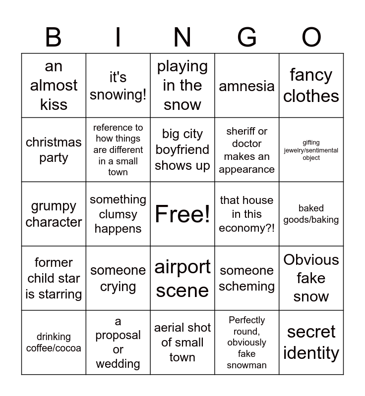 This bingo card has a free space and 57 words: someone encourages a relationship with the love interest, drinking coffee/cocoa, awkward situation, an almost kiss, aerial shot of small town, christmas sweaters, reference to how things are different in a small town, ice skating, sledding, skiing, sheriff or doctor makes an appearance, a misunderstanding, amnesia, talking about the meaning of christmas, people come together to save the day, sharing holiday memories, doing something nice, questionable business model, fancy clothes, something clumsy happens, big city is mentioned, secret identity, that house in this economy?!, short on funds, someone scheming, playing in the snow, cozy fire, big city boyfriend shows up, small town tradition, weather interferes with plans, gifting jewelry/sentimental object, love interest is a former crush, a crisis, kids that need help, shopping for christmas tree, kissing!, baked goods/baking, christmas party, ikea/goodwill furniture on set, grumpy character, cute pet, former child star is starring, it's snowing!, airport scene, family recipe, multiple generations gather, "true meaning" of christmas, real talk bestie, someone crying, a proposal or wedding, santa!!, car trouble, probable product placement, Perfectly round, obviously fake snowman, Brush something off the other’s face, Extremely involved, friendly small town mayor, Christmas song musical scene montage, Obvious fake snow and Impractical shoes/outfit for the weather.