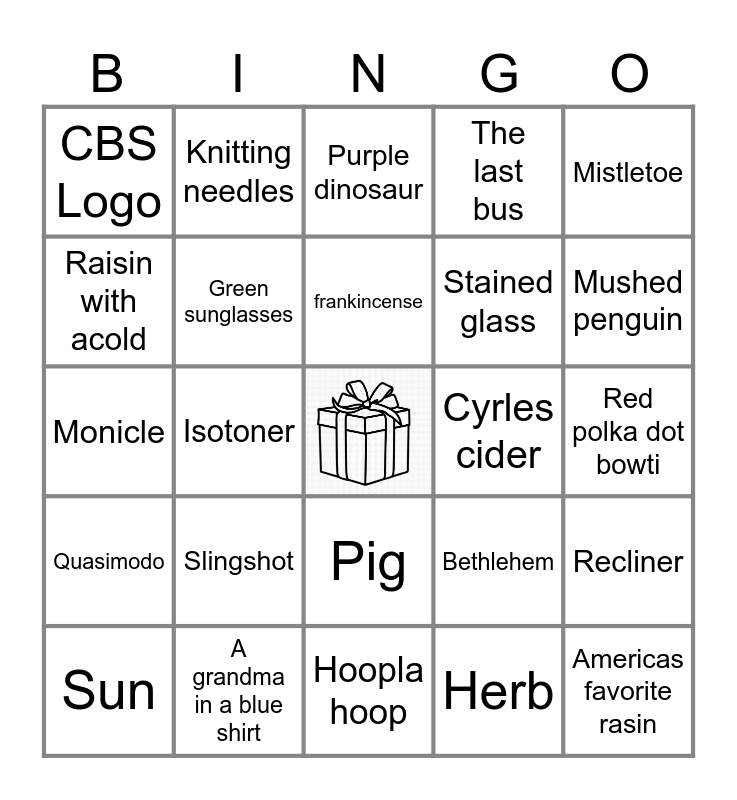 This bingo card has a free space and 30 words: A grandma in a blue shirt, Naked baby, Isotoner, “Stains don’t stay on”, CBS Logo, Purple dinosaur, Green sunglasses, Pig, Cyrles cider, Hoopla hoop, Red polka dot bowti, Americas favorite rasin, Herb, Dougnut, Mushed penguin, Camel with a mushstache, Bethlehem, Quasimodo, Slingshot, Mistletoe, Monicle, Teddy Bear, Knitting needles, Stained glass, Raisin with acold, The last bus, Recliner, Sun, frankincense and Margo.
