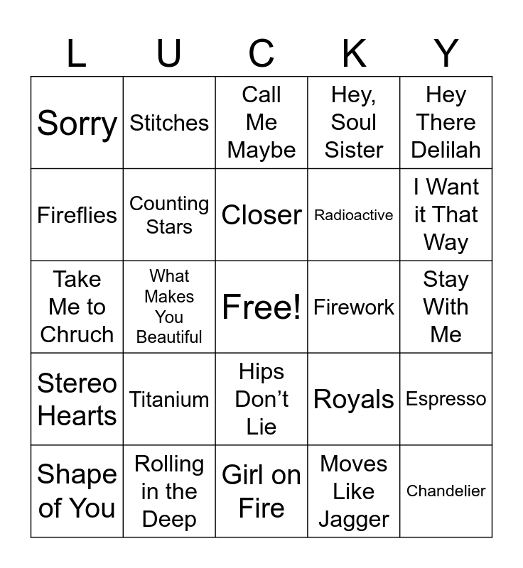 This bingo card has a free space and 29 words: Shape of You, Party in the USA, What Makes You Beautiful, Grenade, Sorry, Call Me Maybe, Counting Stars, Titanium, Firework, Rolling in the Deep, Stay With Me, Chandelier, Girl on Fire, Moves Like Jagger, I Want it That Way, Paparazzi, Hips Don’t Lie, Stereo Hearts, Hey There Delilah, Take Me to Chruch, Royals, Watermelon Sugar, Radioactive, Fireflies, Hey, Soul Sister, Stitches, Espresso, Closer and Toxic.