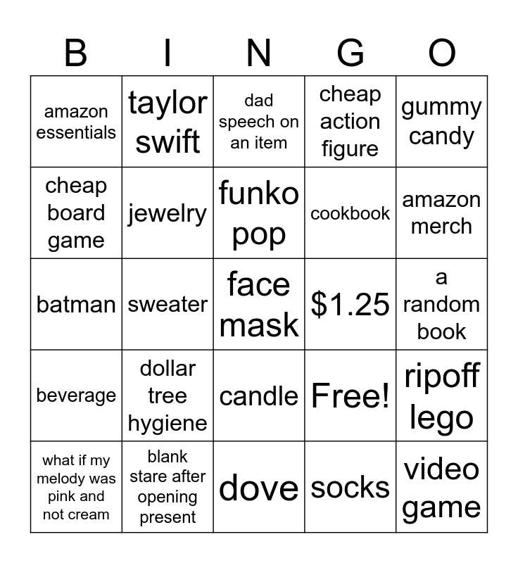 This bingo card has 25 words: dollar tree hygiene, dove, funko pop, what if my melody was pink and not cream, gummy candy, amazon essentials, cheap board game, taylor swift, $1.25, candle, cookbook, batman, Free!, ripoff lego, jewelry, video game, a random book, dad speech on an item, amazon merch, sweater, face mask, blank stare after opening present, beverage, cheap action figure and socks.
