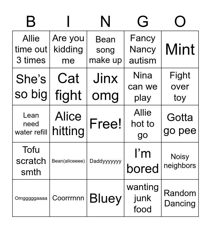 This bingo card has a free space and 24 words: Omgggggaaaa, Bean(aliceeee), Jinx omg, wanting junk food, Mint, Allie time out 3 times, Are you kidding me, Bean song make up, Allie hot to go, Gotta go pee, Lean need water refill, Cat fight, I’m bored, Noisy neighbors, She’s so big, Coorrrnnn, Bluey, Fancy Nancy autism, Fight over toy, Tofu scratch smth, Alice hitting, Daddyyyyyyy, Nina can we play and Random Dancing.