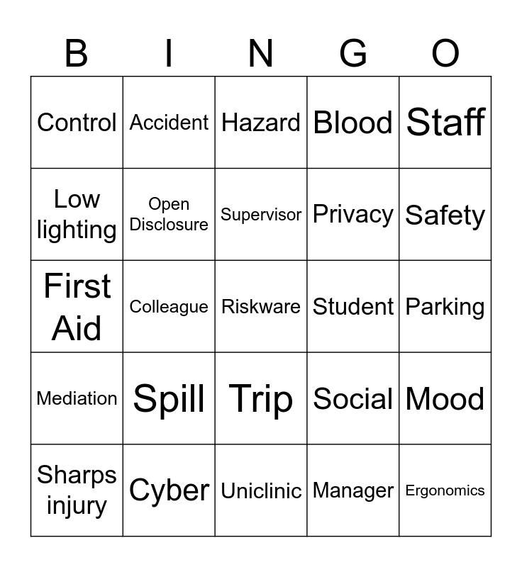 This bingo card has 50 words: Report, Riskware, Policy, Uniclinic, Spill, Injury, Accident, Bullying, Low lighting, Adverse event, Open Disclosure, Blood, Mood, Social, Culture, Workplace, Supervisor, Student, Patient, Staff, Colleague, Manager, Control, Privacy, Psychological, Ergonomics, Safety, Flexible, Hazard, Trip, Bodily Fluids, Ahpra, Mental health, Physical, Cyber, Reduction, Chemicals, Radiation, Placement, Parking, Desk, Travel, Harassment, EAP, Sharps injury, First Aid, R U OK?, Overwhelmed, Mediation and Posture.