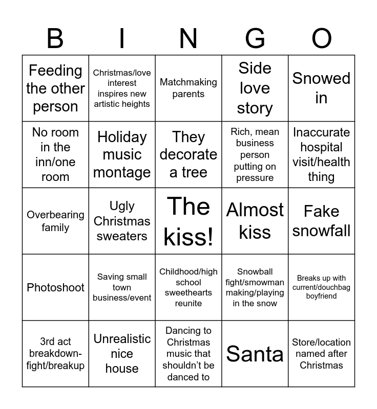 This bingo card has a free space and 42 words: Single mom/dad, They decorate a tree, One main character hates Christmas “Christmas isn’t my thing”, Saving small town business/event, Santa, Breaks up with current/douchbag boyfriend, Store/location named after Christmas, Character named after Christmas, Matchmaking parents, Childhood/high school sweethearts reunite, Fake snowfall, Inaccurate hospital visit/health thing, Ugly Christmas sweaters, Snowed in, Lowkey stalking, Snowball fight/smowman making/playing in the snow, Baking/decorating Christmas cookies, Overbearing family, Dead family, Christmas/love interest inspires new artistic heights, No room in the inn/one room, Product placement, Generic coverup for product, Feeding the other person, Reporter, Family business being sold, Rich, mean business person putting on pressure, Maybe Christmas isn’t so bad, Annoying children, Hiding identity, Physical collision, Photoshoot, Holiday music montage, Dancing to Christmas music that shouldn’t be danced to, Old man resembles Santa-never confirmed or denied, 3rd act breakdown-fight/breakup, Unrealistic nice house, Almost kiss, Proposal, Side kick friend, Side love story and Caroling.