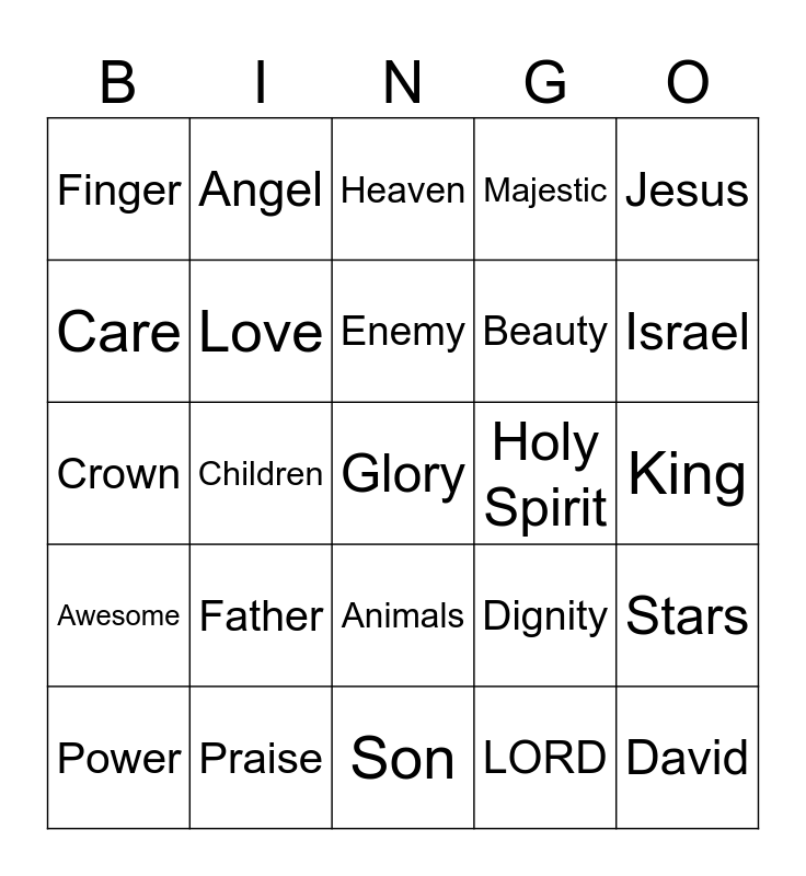 This bingo card has a free space and 29 words: Power, Earth, Children, Babies, Finger, Heaven, Love, Father, Holy Spirit, Praise, King, David, Son, LORD, Israel, Philistine, Animals, Awesome, Jesus, Crown, Dignity, Valuable, Beauty, Care, Majestic, Angel, Stars, Enemy and Moon.