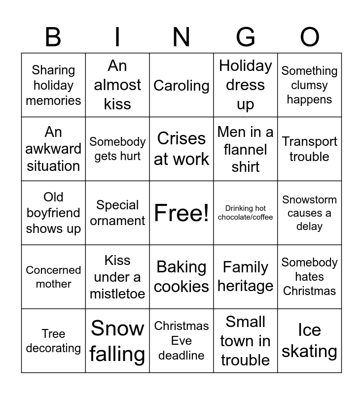 This bingo card has a free space and 24 words: Kiss under a mistletoe, Snow falling, Crises at work, Tree decorating, Something clumsy happens, Sharing holiday memories, An awkward situation, An almost kiss, Drinking hot chocolate/coffee, Baking cookies, Men in a flannel shirt, Old boyfriend shows up, Family heritage, Somebody hates Christmas, Somebody gets hurt, Small town in trouble, Snowstorm causes a delay, Caroling, Transport trouble, Special ornament, Ice skating, Concerned mother, Holiday dress up and Christmas Eve deadline.