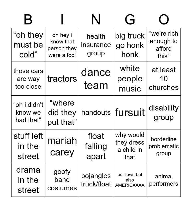 This bingo card has 25 words: mariah carey, bojangles truck/float, dance team, drama in the street, “we’re rich enough to afford this”, “oh they must be cold”, those cars are way too close, oh hey i know that person they were a fool, fursuit, float falling apart, white people music, “oh i didn’t know we had that”, why would they dress a child in that, borderline problematic group, tractors, animal performers, disability group, health insurance group, at least 10 churches, “where did they put that”, handouts, goofy band costumes, stuff left in the street, big truck go honk honk and our town but also AMERICAAAA.