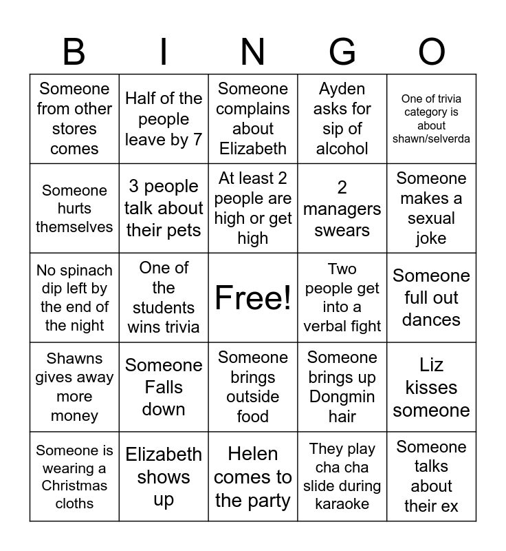 This bingo card has a free space and 24 words: Someone Falls down, Elizabeth shows up, At least 2 people are high or get high, Someone is wearing a Christmas cloths, One of trivia category is about shawn/selverda, Someone from other stores comes, Someone hurts themselves, Half of the people leave by 7, Two people get into a verbal fight, Someone brings outside food, 2 managers swears, No spinach dip left by the end of the night, Someone brings up Dongmin hair, Liz kisses someone, 3 people talk about their pets, They play cha cha slide during karaoke, Someone full out dances, Someone complains about Elizabeth, Someone makes a sexual joke, One of the students wins trivia, Someone talks about their ex, Shawns gives away more money, Ayden asks for sip of alcohol and Helen comes to the party.