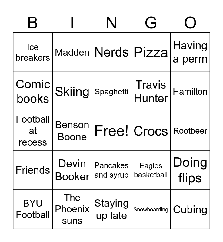 This bingo card has a free space and 24 words: Devin Booker, The Phoenix suns, Spaghetti, BYU Football, Having a perm, Ice breakers, Comic books, Madden, Crocs, Pancakes and syrup, Travis Hunter, Football at recess, Eagles basketball, Doing flips, Skiing, Snowboarding, Rootbeer, Nerds, Hamilton, Benson Boone, Cubing, Friends, Pizza and Staying up late.