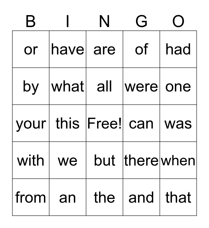 This bingo card has a free space and 24 words: we, an, all, from, had, or, by, have, can, but, were, your, there, when, what, and, was, are, one, this, that, with, of and the.