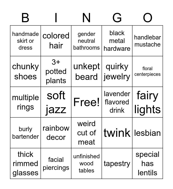 This bingo card has a free space and 24 words: rainbow decor, facial piercings, unkept beard, thick rimmed glasses, handlebar mustache, handmade skirt or dress, chunky shoes, colored hair, lavender flavored drink, weird cut of meat, quirky jewelry, multiple rings, twink, lesbian, 3+ potted plants, tapestry, fairy lights, gender neutral bathrooms, floral centerpieces, soft jazz, special has lentils, burly bartender, black metal hardware and unfinished wood tables.