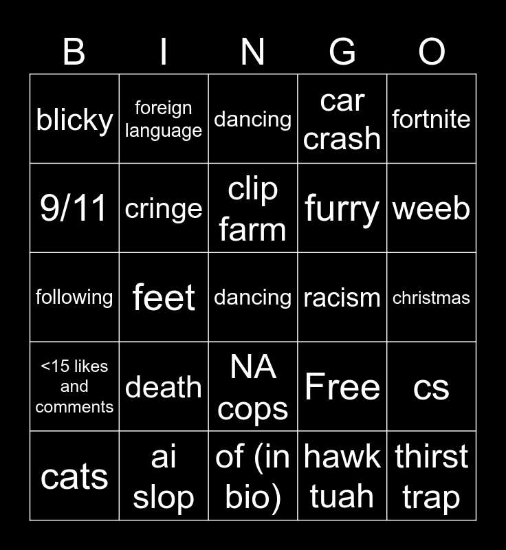 This bingo card has 25 words: death, of (in bio), clip farm, cats, fortnite, blicky, 9/11, foreign language, racism, NA cops, furry, following, Free, cs, cringe, thirst trap, christmas, dancing, weeb, feet, dancing, ai slop, <15 likes and comments, car crash and hawk tuah.