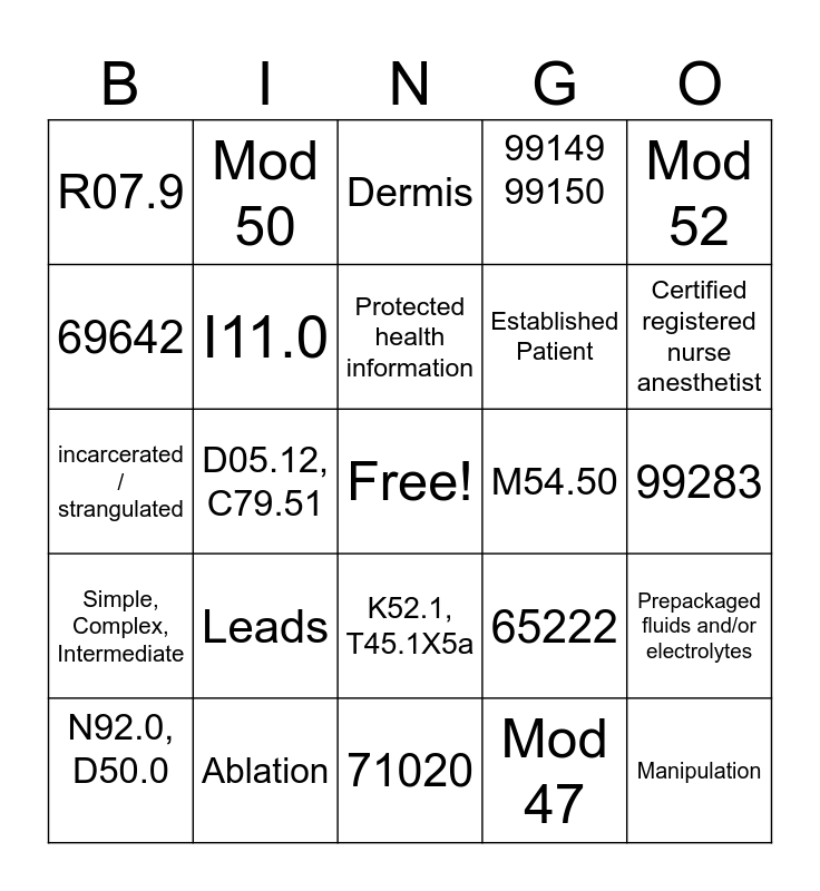 This bingo card has a free space and 24 words: Leads, Ablation, Protected health information, N92.0, D50.0, Mod 52, R07.9, 69642, Mod 50, M54.50, K52.1, T45.1X5a, Established Patient, incarcerated / strangulated, 65222, Prepackaged fluids and/or electrolytes, I11.0, Mod 47, 99283, Dermis, Certified registered nurse anesthetist, D05.12, C79.51, Manipulation, Simple, Complex, Intermediate, 99149 99150 and 71020.