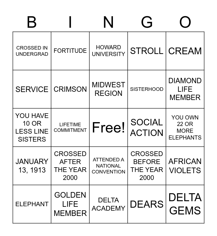 This bingo card has a free space and 34 words: BNAC, DEARS, CHARTER MEMBERS, APRIL 1983, JANUARY 13, 1913, CRIMSON, CREAM, ELEPHANT, FORTITUDE, LEADERSHIP, MIDWEST REGION, HOWARD UNIVERSITY, LEGACY, PYRAMID, SOCIAL ACTION, DIAMOND LIFE MEMBER, GOLDEN LIFE MEMBER, YOU HAVE 10 OR LESS LINE SISTERS, CROSSED AFTER THE YEAR 2000, CROSSED BEFORE THE YEAR 2000, ATTENDED A NATIONAL CONVENTION, YOU’RE A LEGACY, CROSSED IN UNDERGRAD, YOU OWN 22 OR MORE ELEPHANTS, DELTA ACADEMY, DELTA GEMS, STROLL, INTELLIGENCE, SISTERHOOD, SERVICE, AOML, LIFETIME COMMITMENT, AFRICAN VIOLETS and SCHOLARSHIP.