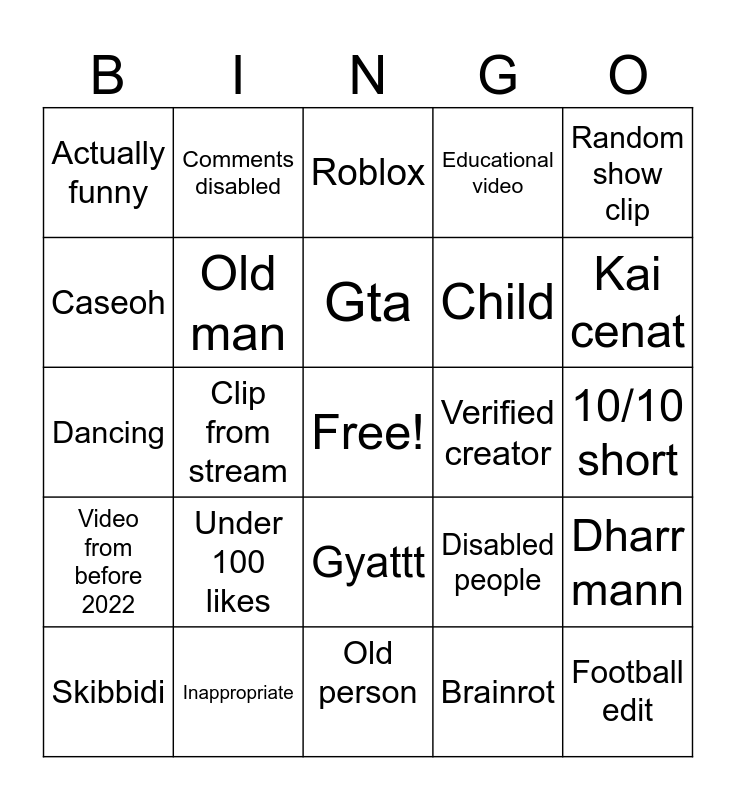This bingo card has a free space and 24 words: Under 100 likes, Inappropriate, Gta, Skibbidi, Random show clip, Actually funny, Caseoh, Comments disabled, Verified creator, Gyattt, Child, Dancing, Disabled people, Dharr mann, Old man, Brainrot, 10/10 short, Roblox, Kai cenat, Clip from stream, Football edit, Video from before 2022, Educational video and Old person.