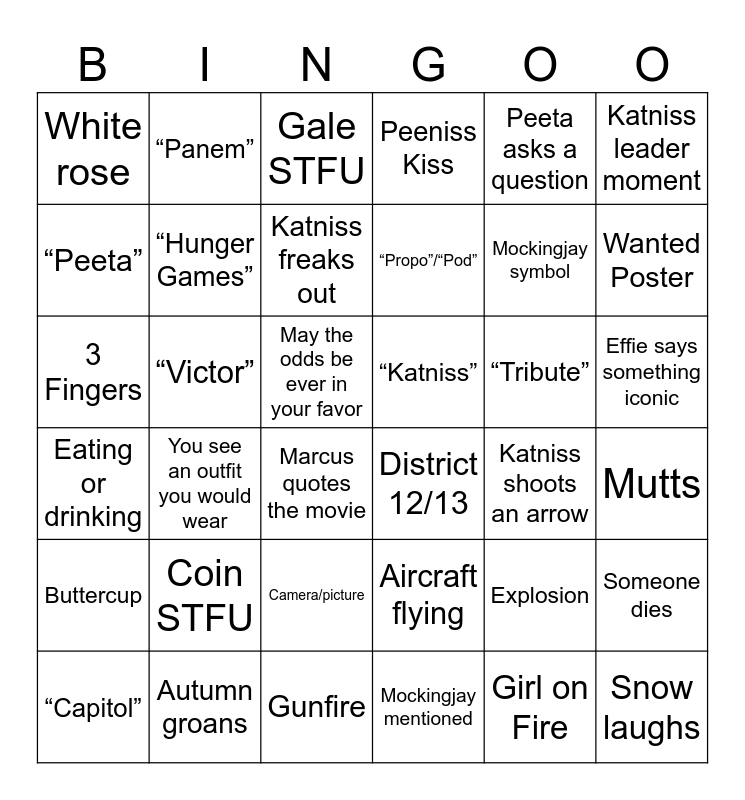 This bingo card has 41 words: Mockingjay mentioned, Mockingjay symbol, Scream, “Peeta”, District 12/13, Effie says something iconic, “Hunger Games”, Alarm/Siren, Peeta asks a question, “Katniss”, Wanted Poster, Peeniss Kiss, 3 Fingers, May the odds be ever in your favor, “Victor”, “Tribute”, “Capitol”, White rose, Girl on Fire, Gale STFU, You see an outfit you would wear, Buttercup, Katniss shoots an arrow, Katniss freaks out, Snow laughs, Explosion, Mutts, Peeta looks rough, “Propo”/“Pod”, Coin STFU, District 1-11, “Panem”, Marcus quotes the movie, Autumn groans, Eating or drinking, Katniss leader moment, Camera/picture, Someone dies, Gunfire, Aircraft flying and “Peace”keepers.