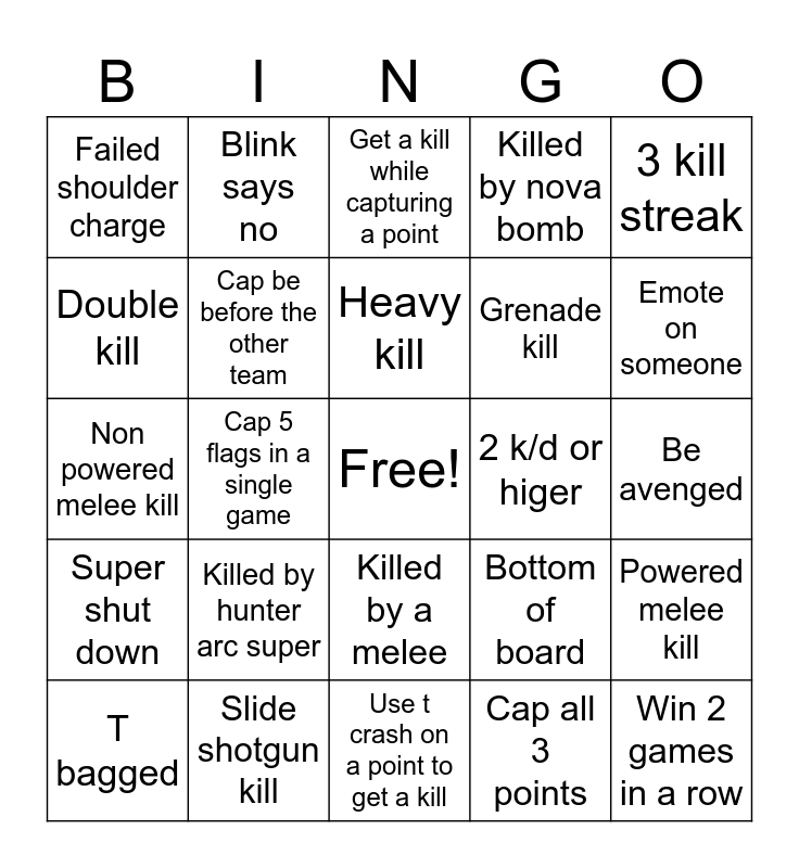 This bingo card has a free space and 24 words: T bagged, Killed by hunter arc super, Heavy kill, Cap all 3 points, 3 kill streak, Failed shoulder charge, Blink says no, Get a kill while capturing a point, 2 k/d or higer, Be avenged, Non powered melee kill, Cap be before the other team, Bottom of board, Powered melee kill, Double kill, Slide shotgun kill, Use t crash on a point to get a kill, Killed by nova bomb, Emote on someone, Super shut down, Cap 5 flags in a single game, Killed by a melee, Grenade kill and Win 2 games in a row.