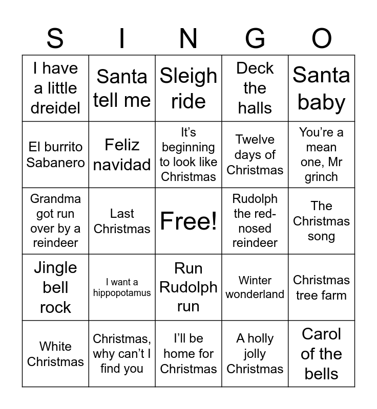 This bingo card has a free space and 33 words: All I want for Christmas is you, Rockin’ around the Christmas tree, Last Christmas, Santa Claus is coming to town, Jingle bell rock, Feliz navidad, Santa baby, White Christmas, Santa tell me, Blue Christmas, It’s beginning to look like Christmas, Sleigh ride, Let it snow! Let it snow! Let it snow!, Frosty the snowman, Rudolph the red-nosed reindeer, You’re a mean one, Mr grinch, Christmas, why can’t I find you, Grandma got run over by a reindeer, I want a hippopotamus, Winter wonderland, Run Rudolph run, Silver bells, I have a little dreidel, The Christmas song, I’ll be home for Christmas, Carol of the bells, Deck the halls, Twelve days of Christmas, El burrito Sabanero, Christmas tree farm, Have yourself a marry little Christmas, A holly jolly Christmas and Nutcracker: the sugarplum fairy.