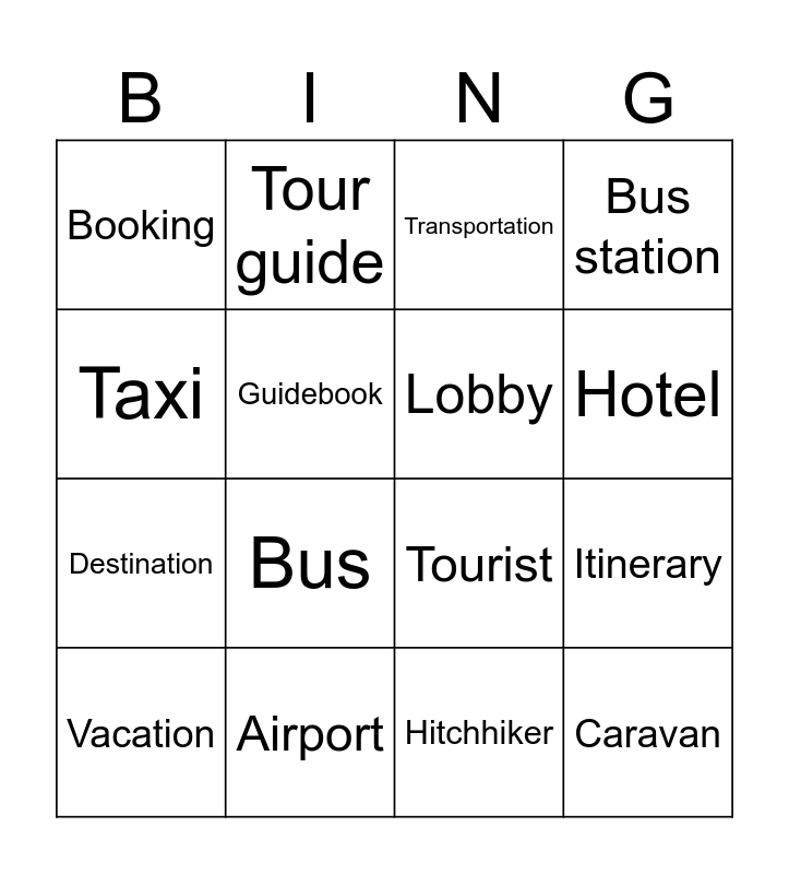 This bingo card has 16 words: Airport, Itinerary, Transportation, Booking, Destination, Tour guide, Tourist, Hitchhiker, Taxi, Guidebook, Vacation, Bus station, Bus, Hotel, Lobby and Caravan.