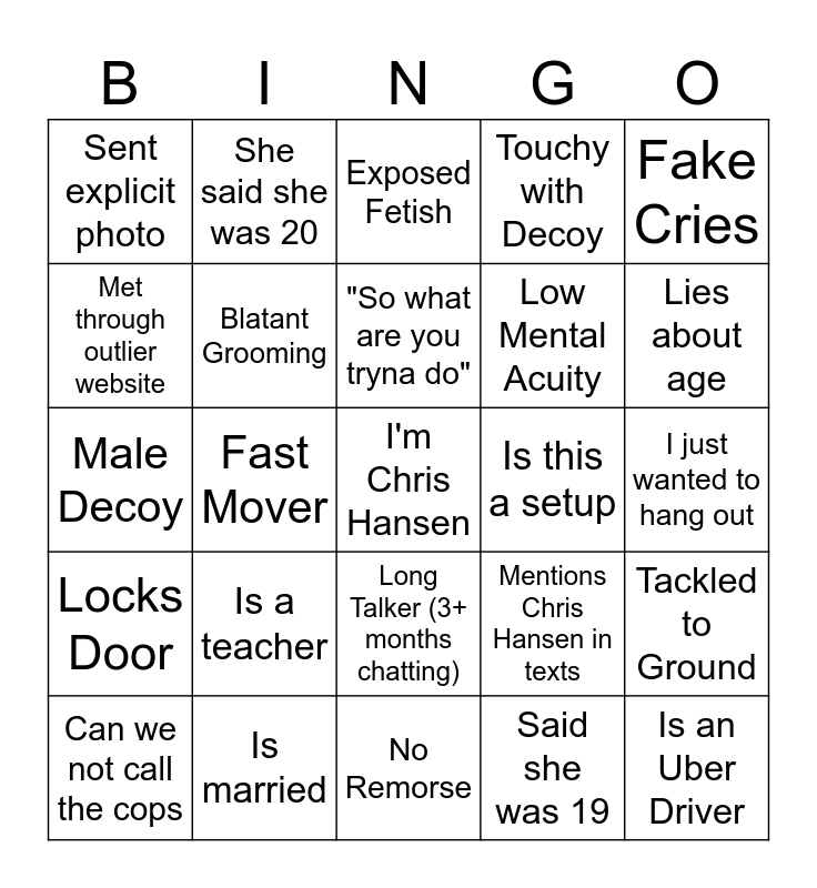 This bingo card has a free space and 69 words: Brings Alcohol, I just wanted to hang out, I wanted to see if it was real, I new it was a setup, Is married, Has young children, Touchy with Decoy, Cries, Fake Cries, Tries to Run, Tackled to Ground, Knows who Chris Hansen is, Sent explicit photo, Exposed Fetish, Not first time (Proven), Fast Mover, Long Talker (3+ months chatting), Low Mental Acuity, It was only talk, Locks Door, Is this a setup, Mentions Chris Hansen in texts, Lies about age, Is under 22, Brings food, Please have a seat, I've never done this before, Admits to bringing condoms, Said she was 19, She Said she was 18, She said she was 20, She said she was 22, Says they didn't bring condoms, Lies about not bringing condoms, Brings Drugs, Chris breaks character, Chris recites blasphemy, Met through mainstream website, Met through outlier website, Has Official Capacity, Is a teacher, Is an Uber Driver, I must have been hacked, Funny Man, I've learned my lesson, Can we not call the cops, This was just a stupid mistake, Hyper Infatuation, Marriage Proposed, Blatant Grooming, "So what are you tryna do", Pet Name, Uses real Info, No Remorse, Seeks Sympathy, Feigns Medical Issue, Negotiates with 'Guardian', Virgin, Female Decoy, Male Decoy, Is not Familiar with Chris, Pred on Mute, I was just going to leave, I wanted to save them, I'm just here to see a friend, Long Distance mover, Just got off work, Closeted and Threatens Unalive.