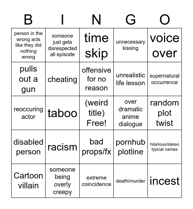 This bingo card has a free space and 24 words: racism, someone being overly creepy, offensive for no reason, Cartoon villain, voice over, person in the wrong acts like they did nothing wrong, pulls out a gun, someone just gets disrespected all episode, over dramatic anime dialogue, bad props/fx, unrealistic life lesson, reoccuring actor, pornhub plotline, hilarious/stereo typical names, cheating, death/murder, random plot twist, time skip, supernatural occurrence, taboo, incest, disabled person, unnecessary kissing and extreme coincidence.