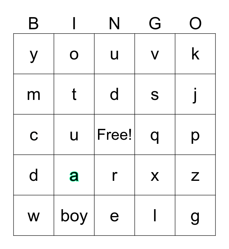 This bingo card has a free space and 24 words: a, boy, d, w, k, y, m, o, q, r, s, c, x, z, t, l, p, u, j, u, g, d, v and e.