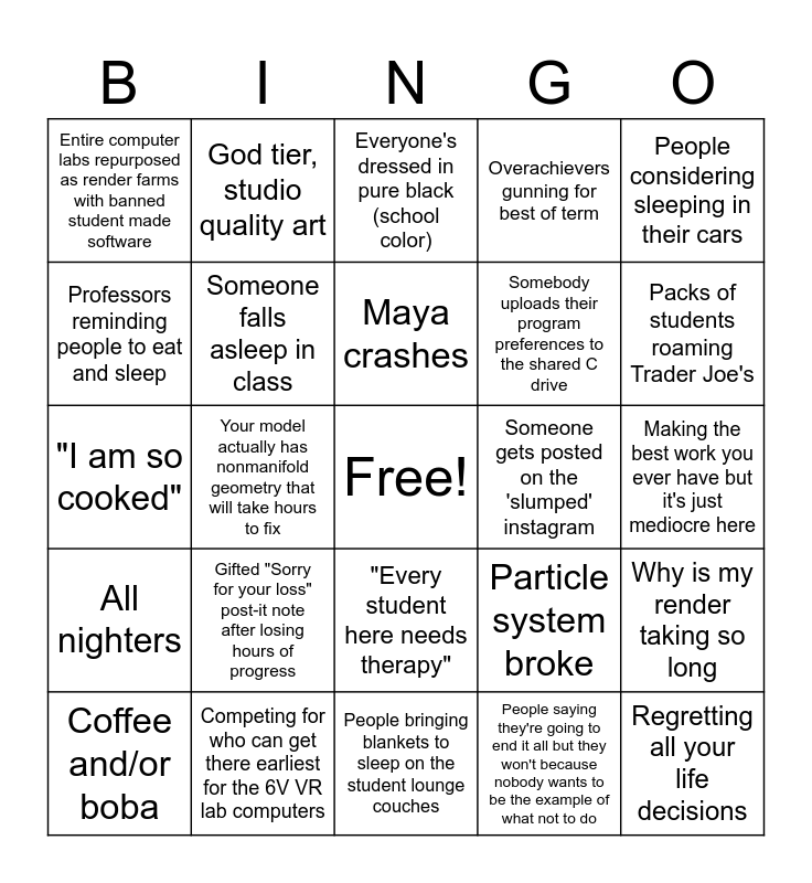This bingo card has a free space and 24 words: Gifted "Sorry for your loss" post-it note after losing hours of progress, Competing for who can get there earliest for the 6V VR lab computers, Maya crashes, Coffee and/or boba, People considering sleeping in their cars, Entire computer labs repurposed as render farms with banned student made software, Professors reminding people to eat and sleep, God tier, studio quality art, Someone gets posted on the 'slumped' instagram, "Every student here needs therapy", Somebody uploads their program preferences to the shared C drive, "I am so cooked", Particle system broke, Why is my render taking so long, Someone falls asleep in class, People saying they're going to end it all but they won't because nobody wants to be the example of what not to do, Making the best work you ever have but it's just mediocre here, Everyone's dressed in pure black (school color), Packs of students roaming Trader Joe's, Your model actually has nonmanifold geometry that will take hours to fix, Regretting all your life decisions, All nighters, Overachievers gunning for best of term and People bringing blankets to sleep on the student lounge couches.