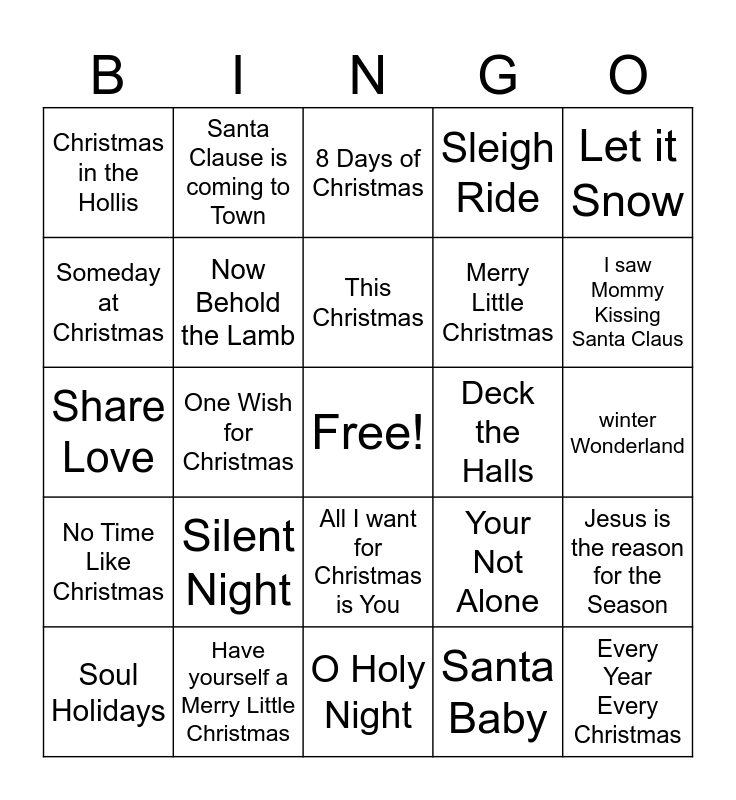 This bingo card has a free space and 25 words: Silent Night, O Holy Night, This Christmas, Soul Holidays, Let it Snow, Christmas in the Hollis, Someday at Christmas, Santa Clause is coming to Town, Deck the Halls, All I want for Christmas is You, Merry Little Christmas, Share Love, Your Not Alone, Jesus is the reason for the Season, Now Behold the Lamb, Joy to the World, winter Wonderland, 8 Days of Christmas, I saw Mommy Kissing Santa Claus, One Wish for Christmas, Every Year Every Christmas, Have yourself a Merry Little Christmas, No Time Like Christmas, Sleigh Ride and Santa Baby.
