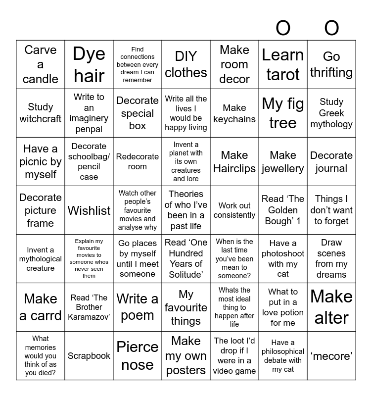 This bingo card has 49 words: What to put in a love potion for me, My fig tree, The loot I’d drop if I were in a video game, Wishlist, Redecorate room, Things I don’t want to forget, Dye hair, Pierce nose, Learn tarot, Read ‘One Hundred Years of Solitude’, Go thrifting, DIY clothes, Make jewellery, Make Hairclips, Read ‘The Brother Karamazov’, Read ‘The Golden Bough’ 1, Study witchcraft, Study Greek mythology, Make alter, Make room decor, Make keychains, Watch other people’s favourite movies and analyse why, Carve a candle, Write to an imaginery penpal, What memories would you think of as you died?, Decorate special box, Decorate journal, Scrapbook, Invent a planet with its own creatures and lore, Decorate schoolbag/ pencil case, ‘mecore’, Work out consistently, Make a carrd, Write a poem, Decorate picture frame, When is the last time you’ve been mean to someone?, Have a photoshoot with my cat, Draw scenes from my dreams, Have a picnic by myself, Go places by myself until I meet someone, My favourite things, Invent a mythological creature, Theories of who I’ve been in a past life, Make my own posters, Write all the lives I would be happy living, Find connections between every dream I can remember, Whats the most ideal thing to happen after life, Explain my favourite movies to someone whos never seen them and Have a philosophical debate with my cat.