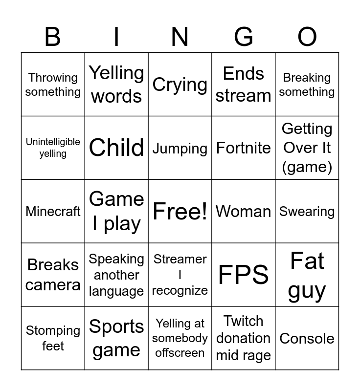 This bingo card has a free space and 24 words: Speaking another language, Sports game, Jumping, Stomping feet, Breaking something, Throwing something, Unintelligible yelling, Yelling words, Woman, Streamer I recognize, Fortnite, Minecraft, FPS, Fat guy, Child, Twitch donation mid rage, Swearing, Crying, Getting Over It (game), Game I play, Console, Breaks camera, Ends stream and Yelling at somebody offscreen.