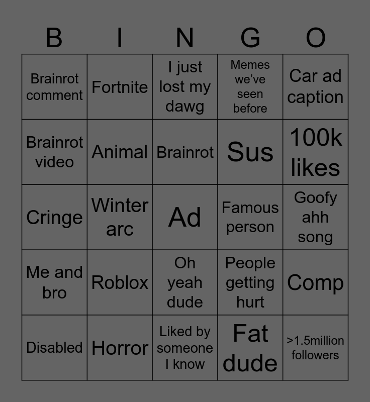 This bingo card has a free space and 24 words: Roblox, Horror, Brainrot, Disabled, Car ad caption, Brainrot comment, Brainrot video, Fortnite, Famous person, Oh yeah dude, Sus, Cringe, People getting hurt, Comp, Animal, Fat dude, Goofy ahh song, I just lost my dawg, 100k likes, Winter arc, >1.5million followers, Me and bro, Memes we’ve seen before and Liked by someone I know.