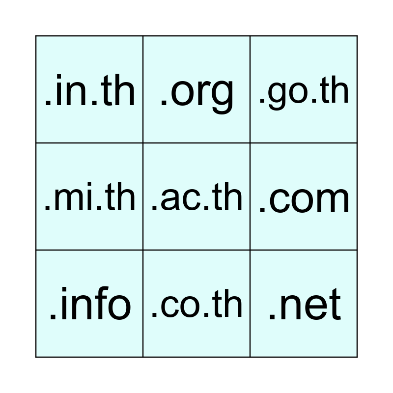 This bingo card has a free space and 8 words: .com, .go.th, .org, .info, .in.th, .net, .mi.th and .co.th.