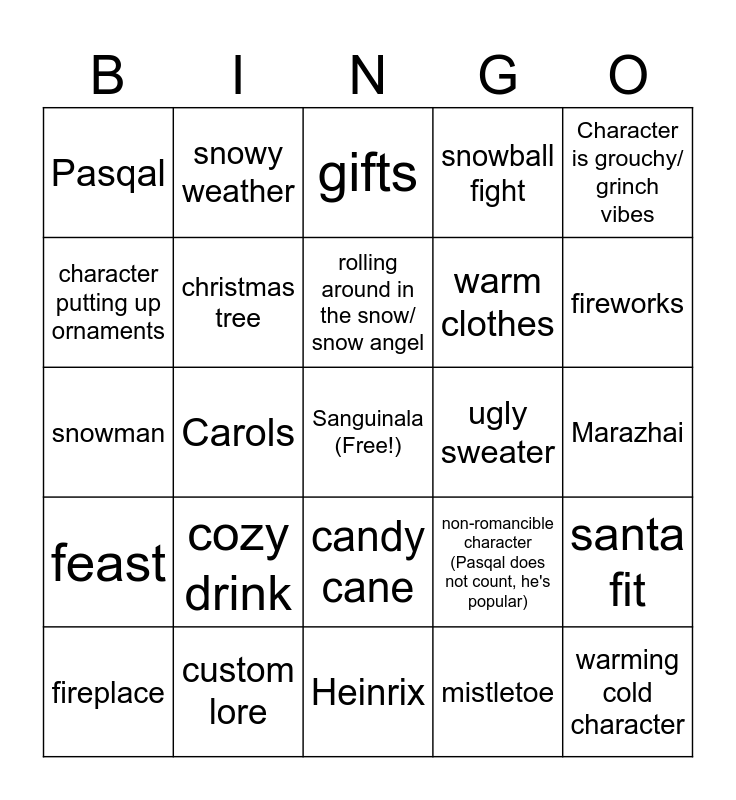 This bingo card has a free space and 24 words: cozy drink, custom lore, rolling around in the snow/ snow angel, fireplace, Character is grouchy/ grinch vibes, Pasqal, character putting up ornaments, snowy weather, ugly sweater, candy cane, warm clothes, snowman, non-romancible character (Pasqal does not count, he's popular), santa fit, christmas tree, mistletoe, Marazhai, gifts, fireworks, Carols, warming cold character, feast, snowball fight and Heinrix.