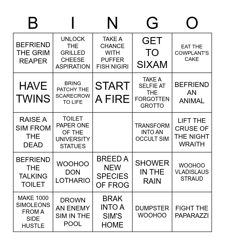 This bingo card has a free space and 24 words: WOOHOO DON LOTHARIO, DROWN AN ENEMY SIM IN THE POOL, START A FIRE, MAKE 1000 SIMOLEONS FROM A SIDE HUSTLE, EAT THE COWPLANT'S CAKE, BEFRIEND THE GRIM REAPER, HAVE TWINS, UNLOCK THE GRILLED CHEESE ASPIRATION, TRANSFORM INTO AN OCCULT SIM, BREED A NEW SPECIES OF FROG, TAKE A SELFIE AT THE FORGOTTEN GROTTO, RAISE A SIM FROM THE DEAD, SHOWER IN THE RAIN, WOOHOO VLADISLAUS STRAUD, BRING PATCHY THE SCARECROW TO LIFE, DUMPSTER WOOHOO, LIFT THE CRUSE OF THE NIGHT WRAITH, TAKE A CHANCE WITH PUFFER FISH NIGIRI, BEFRIEND AN ANIMAL, TOILET PAPER ONE OF THE UNIVERSITY STATUES, FIGHT THE PAPARAZZI, BEFRIEND THE TALKING TOILET, GET TO SIXAM and BRAK INTO A SIM'S HOME.