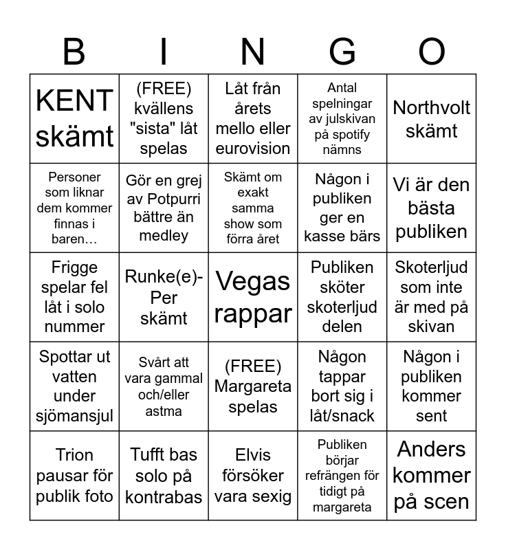 This bingo card has 25 words: Svårt att vara gammal och/eller astma, Elvis försöker vara sexig, Skämt om exakt samma show som förra året, Trion pausar för publik foto, Northvolt skämt, KENT skämt, Personer som liknar dem kommer finnas i baren…, (FREE) kvällens "sista" låt spelas, Publiken sköter skoterljud delen, (FREE) Margareta spelas, Någon i publiken ger en kasse bärs, Frigge spelar fel låt i solo nummer, Någon tappar bort sig i låt/snack, Någon i publiken kommer sent, Gör en grej av Potpurri bättre än medley, Anders kommer på scen, Skoterljud som inte är med på skivan, Låt från årets mello eller eurovision, Vi är den bästa publiken, Runke(e)-Per skämt, Vegas rappar, Tufft bas solo på kontrabas, Spottar ut vatten under sjömansjul, Antal spelningar av julskivan på spotify nämns and Publiken börjar refrängen för tidigt på margareta.
