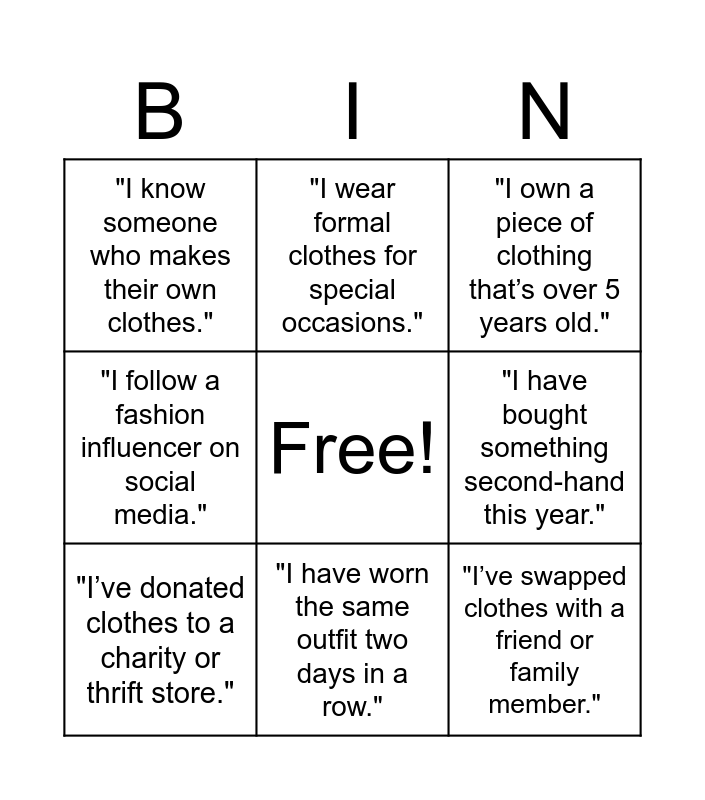 This bingo card has a free space and 25 words: "I wear something green at least once a week.", "I’ve bought clothes from a fast fashion brand this month.", "I have worn the same outfit two days in a row.", "I prefer vintage or retro-style clothing.", "I’ve swapped clothes with a friend or family member.", "I know someone who makes their own clothes.", "I have bought something second-hand this year.", "I wear formal clothes for special occasions.", "I’ve tried DIY (Do-It-Yourself) fashion or clothing repair.", "I have clothes in my wardrobe I’ve never worn.", "I own more than 10 pairs of shoes.", "I’ve watched a documentary or video about fast fashion.", "I prefer bright colors over neutral tones.", "I shop for clothes during seasonal sales.", "I’ve donated clothes to a charity or thrift store.", "I’ve bought or sold clothes online.", "I know the materials used to make my favorite outfit.", "I own a piece of clothing that’s over 5 years old.", "I’ve borrowed clothes from someone else recently.", "I wear a uniform or specific outfit for work/school.", "I’ve bought eco-friendly or organic clothing.", "I know where most of my clothes are manufactured.", "I’ve altered an item of clothing to fit me better.", "I follow a fashion influencer on social media." and "I own a piece of clothing with a unique pattern or design.".