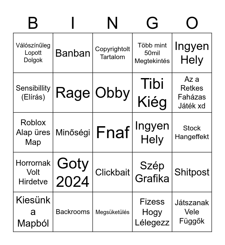This bingo card has a free space and 24 words: Kiesünk a Mapból, Goty 2024, Obby, Fizess Hogy Lélegezz, Ingyen Hely, Válószínűleg Lopott Dolgok, Banban, Copyrightolt Tartalom, Ingyen Hely, Stock Hangeffekt, Roblox Alap üres Map, Rage, Szép Grafika, Shitpost, Sensibillity (Elírás), Backrooms, Megsüketülés, Több mint 50mil Megtekintés, Az a Retkes Faházas Játék xd, Horrornak Volt Hirdetve, Minőségi, Clickbait, Tibi Kiég and Játszanak Vele Függők.