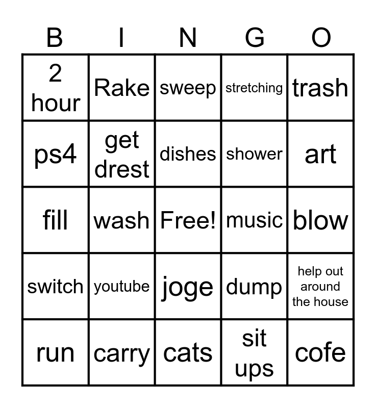This bingo card has a free space and 24 words: youtube, carry, dishes, run, trash, 2 hour, ps4, Rake, music, joge, shower, fill, dump, help out around the house, get drest, sit ups, blow, sweep, art, wash, cofe, switch, stretching and cats.
