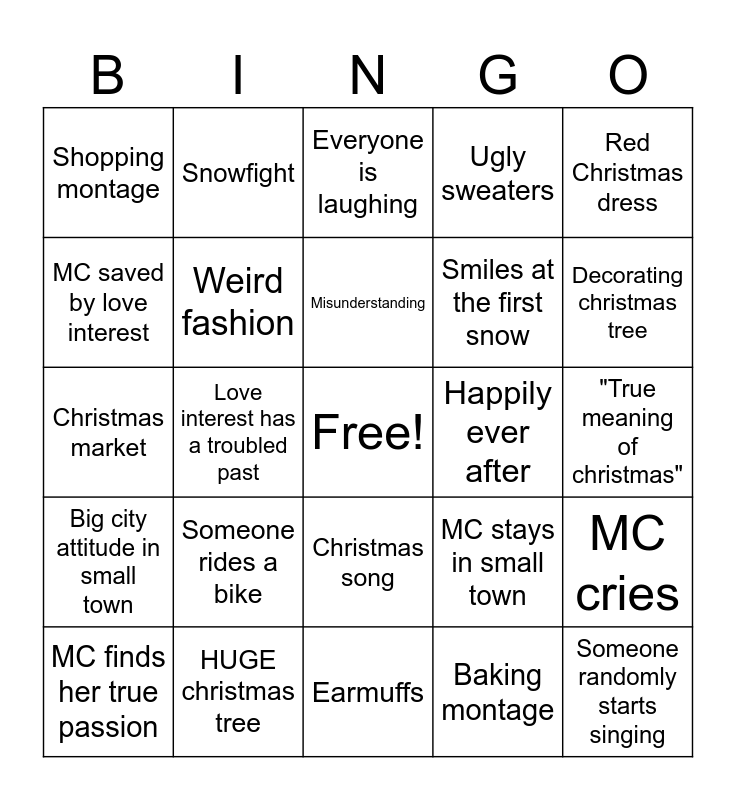 This bingo card has a free space and 24 words: Someone rides a bike, HUGE christmas tree, Misunderstanding, MC finds her true passion, Red Christmas dress, Shopping montage, MC saved by love interest, Snowfight, Happily ever after, Christmas song, Smiles at the first snow, Christmas market, MC stays in small town, MC cries, Weird fashion, Baking montage, "True meaning of christmas", Everyone is laughing, Decorating christmas tree, Love interest has a troubled past, Someone randomly starts singing, Big city attitude in small town, Ugly sweaters and Earmuffs.