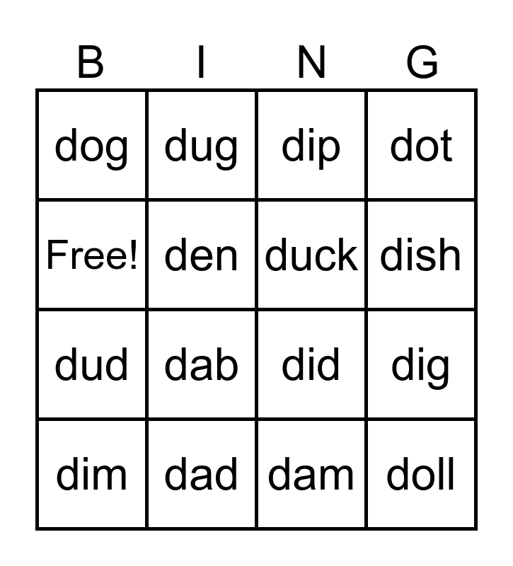 This bingo card has 16 words: dad, dig, dip, dog, dud, dug, did, dam, Free!, den, dim, dot, dab, dish, duck and doll.