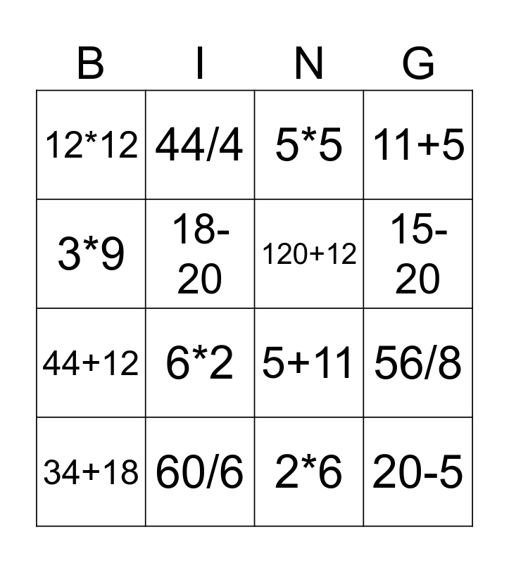 This bingo card has 20 words: 56/8, 43-15, 5*5, 3/3, 34+18, 3*9, 60/6, 12*12, 44+12, 44/4, 6*2, 5+11, 18-20, 20-5, 120+12, 138-102, 15-20, 11+5, 2*6 and 20-18.