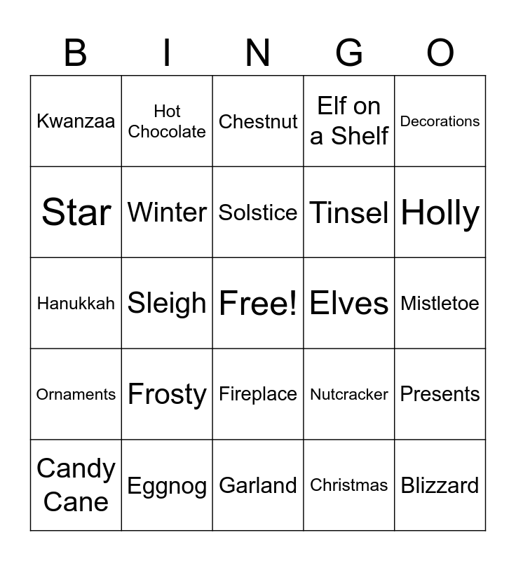 This bingo card has a free space and 45 words: Advent, Blizzard, Candle, Candy Cane, Carols, Christmas, Chestnut, Chimney, Decorations, Eggnog, Elf on a Shelf, Elves, Fireplace, Frosty, Fruitcake, Garland, Gingerbread, Hanukkah, Holiday, Holly, Hot Chocolate, Icicle, Jingle Bells, Kwanzaa, Manger, Mistletoe, Nativity, Noel, Nutcracker, Ornaments, Poinsettia, Presents, Reindeer, Santa Claus, Scrooge, Sleigh, Snowflake, Snowman, Stocking, Solstice, Star, Tinsel, Ugly Sweater, Winter and Wreath.