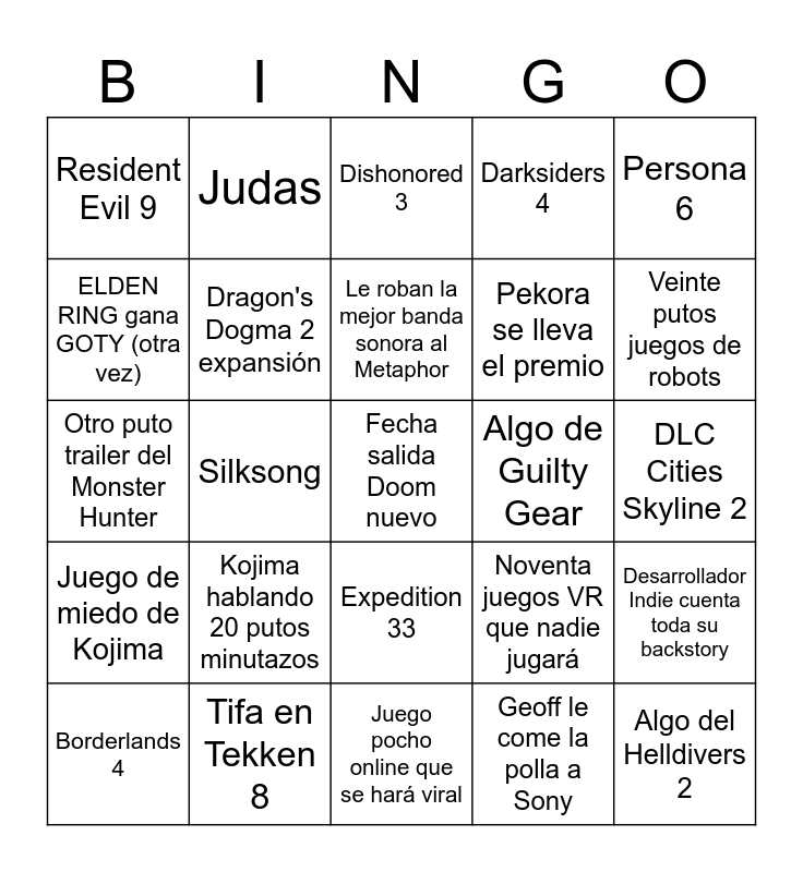 This bingo card has a free space and 24 words: Kojima hablando 20 putos minutazos, Tifa en Tekken 8, Le roban la mejor banda sonora al Metaphor, Borderlands 4, Persona 6, Resident Evil 9, ELDEN RING gana GOTY (otra vez), Judas, Algo de Guilty Gear, Expedition 33, Pekora se lleva el premio, Otro puto trailer del Monster Hunter, Noventa juegos VR que nadie jugará, Desarrollador Indie cuenta toda su backstory, Dragon's Dogma 2 expansión, Geoff le come la polla a Sony, DLC Cities Skyline 2, Dishonored 3, Veinte putos juegos de robots, Silksong, Algo del Helldivers 2, Juego de miedo de Kojima, Darksiders 4 and Juego pocho online que se hará viral.