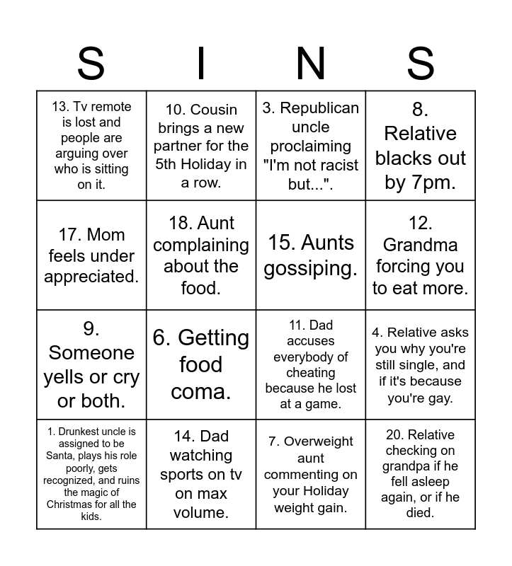 This bingo card has 20 words: 1. Drunkest uncle is assigned to be Santa, plays his role poorly, gets recognized, and ruins the magic of Christmas for all the kids., 2. Creepy uncle makes a sexually inappropriate joke., 3. Republican uncle proclaiming "I'm not racist but..."., 4. Relative asks you why you're still single, and if it's because you're gay., 5. Cousin vomits in a secret place only for the host to find out 2 days later., 6. Getting food coma., 7. Overweight aunt commenting on your Holiday weight gain., 8. Relative blacks out by 7pm., 9. Someone yells or cry or both., 10. Cousin brings a new partner for the 5th Holiday in a row., 11. Dad accuses everybody of cheating because he lost at a game., 12. Grandma forcing you to eat more., 13. Tv remote is lost and people are arguing over who is sitting on it., 14. Dad watching sports on tv on max volume., 15. Aunts gossiping., 16. Diabetic relative eating sweets like there's no tomorrow., 17. Mom feels under appreciated., 18. Aunt complaining about the food., 19. Progressive/woke Gen Z cousin feeling triggered by everyone over 50 years old. and 20. Relative checking on grandpa if he fell asleep again, or if he died..