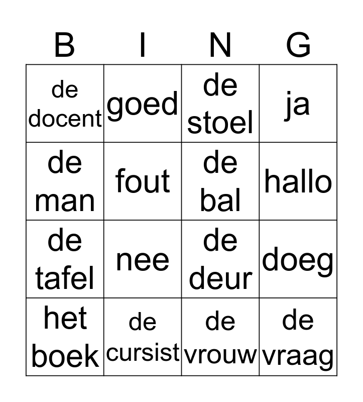 This bingo card has 16 words: de cursist, doeg, de stoel, de docent, de tafel, goed, de deur, de vrouw, de man, fout, het boek, ja, nee, hallo, de bal and de vraag.