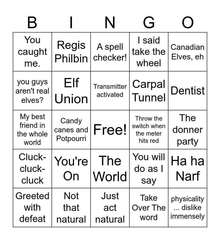 This bingo card has a free space and 32 words: Take Over The word, Letter to Santa, Candy canes and Potpourri, Hershel the Hanukkah goblin, Cluck-cluck-cluck, Elf Union, Canadian Elves, eh, Ha ha Narf, Regis Philbin, Noodle noggin, Transmitter activated, A spell checker!, Quiet Pinky, Zoink, Throw the switch when the meter hits red, My dear friend Brain, Greeted with defeat, My best friend in the whole world, The World, You're On, You will do as I say, I command you, The donner party, Not that natural, physicality ... dislike immensely, I said take the wheel, Carpal Tunnel, you guys aren't real elves?, You caught me., Just act natural, We're getting away and Dentist.
