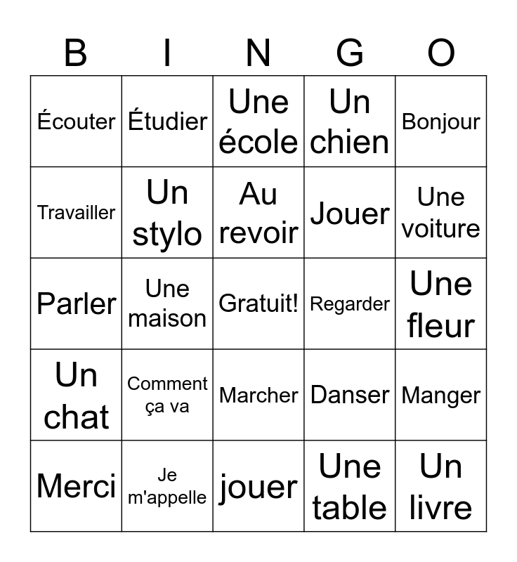 This bingo card has a free space and 24 words: Comment ça va, Je m'appelle, Au revoir, Merci, Bonjour, Écouter, Travailler, Étudier, Regarder, Marcher, Jouer, Parler, Danser, Manger, Un stylo, Une table, Une fleur, Une école, Une voiture, Une maison, Un livre, Un chat, Un chien and jouer.
