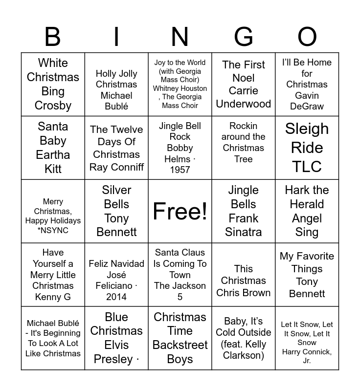 This bingo card has a free space and 24 words: Feliz Navidad José Feliciano · 2014, Blue Christmas Elvis Presley ·, Jingle Bell Rock Bobby Helms · 1957, Michael Bublé - It's Beginning To Look A Lot Like Christmas, I’ll Be Home for Christmas Gavin DeGraw, White Christmas Bing Crosby, Santa Baby Eartha Kitt, Holly Jolly Christmas Michael Bublé, Jingle Bells Frank Sinatra, Santa Claus Is Coming To Town The Jackson 5, Rockin around the Christmas Tree, Merry Christmas, Happy Holidays *NSYNC, This Christmas Chris Brown, My Favorite Things Tony Bennett, The Twelve Days Of Christmas Ray Conniff, Baby, It’s Cold Outside (feat. Kelly Clarkson), Hark the Herald Angel Sing, Joy to the World (with Georgia Mass Choir) Whitney Houston , The Georgia Mass Choir, Sleigh Ride TLC, Silver Bells Tony Bennett, Let It Snow, Let It Snow, Let It Snow Harry Connick, Jr., Have Yourself a Merry Little Christmas Kenny G, The First Noel Carrie Underwood and Christmas Time Backstreet Boys.