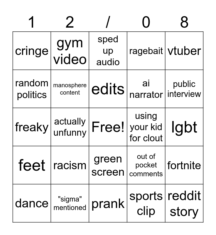 This bingo card has a free space and 24 words: racism, "sigma" mentioned, edits, dance, vtuber, cringe, random politics, gym video, using your kid for clout, green screen, ai narrator, freaky, out of pocket comments, fortnite, manosphere content, sports clip, lgbt, sped up audio, public interview, actually unfunny, reddit story, feet, ragebait and prank.