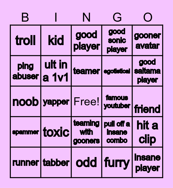 This bingo card has a free space and 24 words: runner, toxic, teamer, furry, gooner avatar, troll, kid, good player, famous youtuber, friend, noob, ult in a 1v1, pull off a insane combo, hit a clip, ping abuser, tabber, odd, good sonic player, good saitama player, spammer, yapper, teaming with gooners, egotistical and insane player.