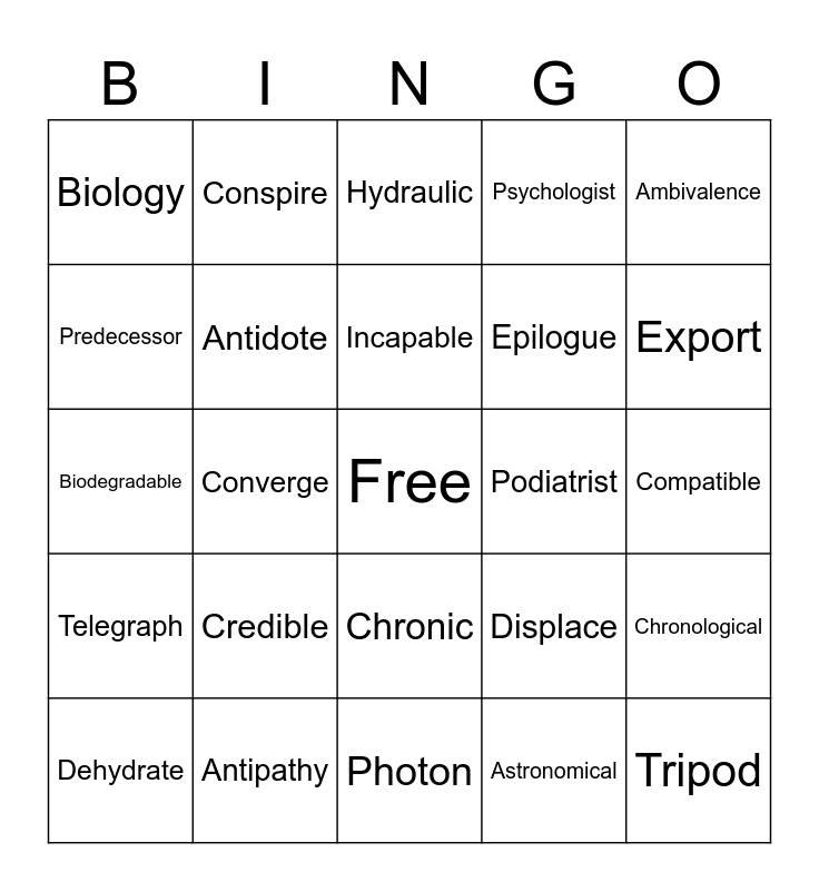 This bingo card has a free space and 39 words: Irrelevant, Amendment, Import, Antidote, Dehydrate, Chronic, Incapable, Counteract, Ambivalence, Telegraph, Converge, Psychologist, Tripod, Compatible, Podiatrist, Credible, Homophone, Biology, Incredulous, Displace, Predecessor, Photon, Epilogue, Export, Graphite, Deprive, Monologue, Telephoto, Trilogy, Conspire, Counterpart, Teleport, Hydraulic, Antipathy, Astronomical, Fondness, Chronological, Biodegradable and Monopoly.